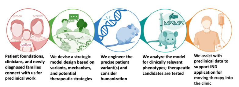The Rare Disease Translational Center works to understand the patient, the disease, and future therapeutic strategies. We work directly with foundations & their scientific partners to ascertain the community’s needs and identify patient pathogenic variants to assess in mouse models.